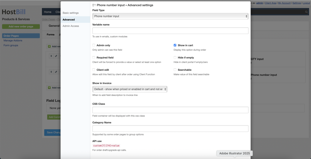 N new addition to HostBill’s powerful form builder is the Phone Number Input. This new field type is designed specifically for collecting phone numbers in a standardized and user-friendly format. It also comes with a range of useful configuration options: you can enable Client edit to allow clients to update their phone number after placing an order via the Client Function; use Show in cart to display the phone number field during the order process; enable Hide if empty to keep the field hidden in the client portal when no value is provided; and make it Searchable to easily locate client records based on phone numbers. Provided phone number is easily accessible in the account details.