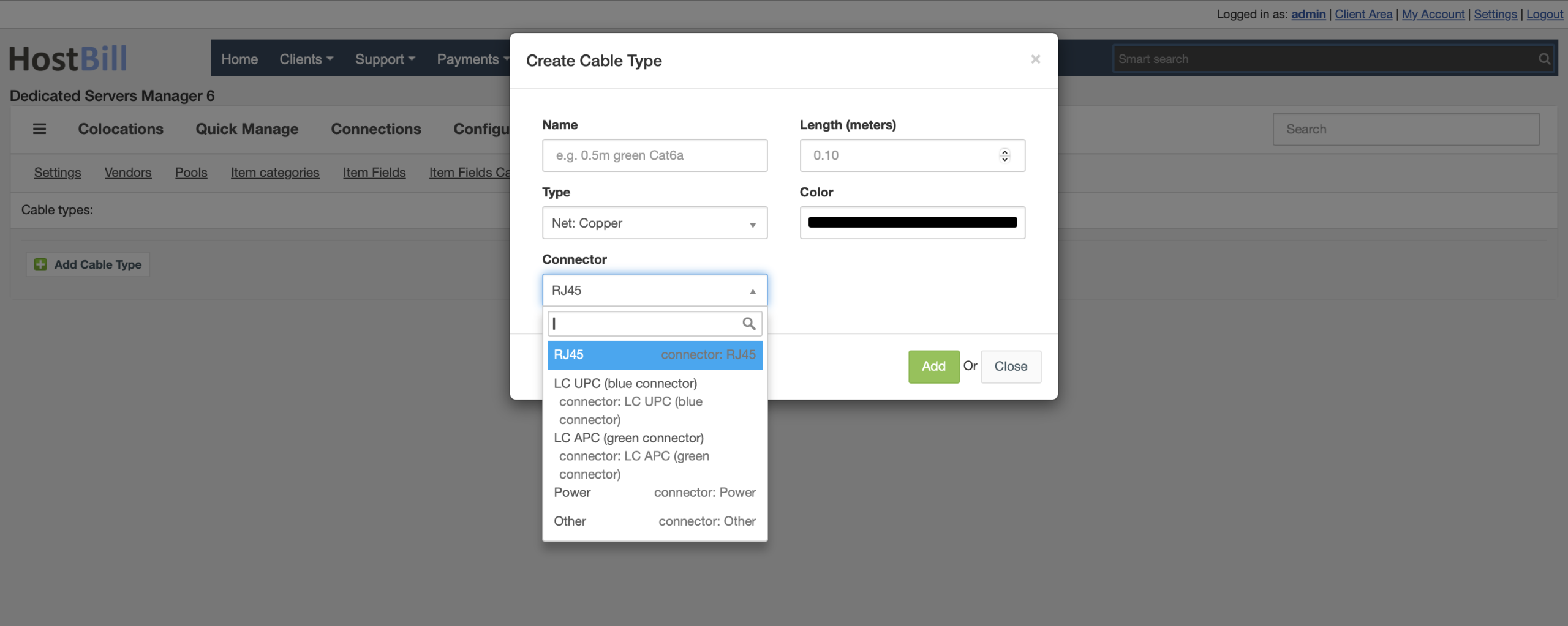 The latest update to the Dedicated Servers (Colocation) Manager module introduces a comprehensive cable management system. A new “Cables” tab has been added to the Configuration section, where administrators can define standardized cable types. Each cable type includes detailed attributes such as name, category (including copper, fiber, power, or other), compatible connector types, precise length (with decimal support), color selection, and integration with Inventory Manager through a dedicated identifier. This structured approach allows providers to maintain a consistent catalog of cables and accurately reflect real-world infrastructure.